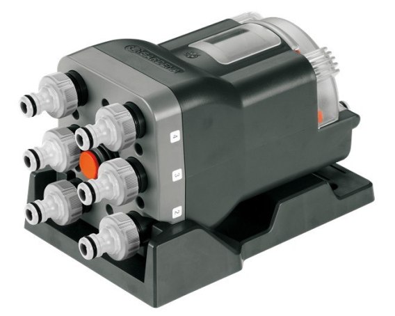 W połączeniu ze sterownikiem nawadniania GARDENA C1060 automatyczny dzielnik wody może nawadniać do 6 obszarów ogrodu jeden po drugim.