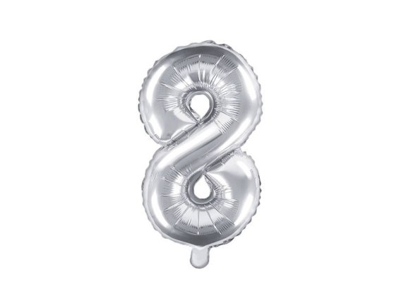 Balon foliowy metalizowany Cyfra 8 w kolorze srebrnym, rozmiar ok. 35 cm. Balon w oryginalnym opakowaniu producenta, z certyfikatem CE.
