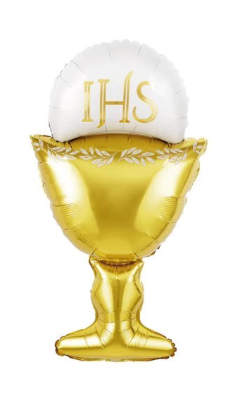 Idealny balon foliowy do dekoracji przyjęcia z okazji Pierwszej Komunii Świętej. Balon ma kszt.ałt złotego, błyszczącego kielicha, z delikatnym białym zdobieniem na brzegu. Z kielicha wystaje biała hostia z napisem IHS.