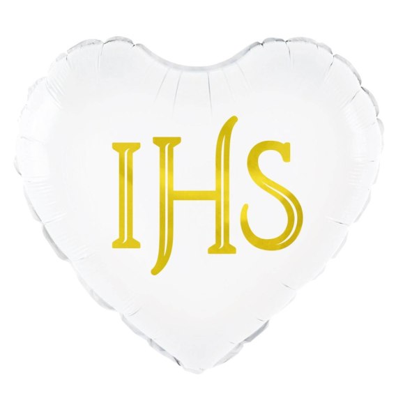 Balon foliowy serce z napisem Komunia święta i nadrukiem IHS.