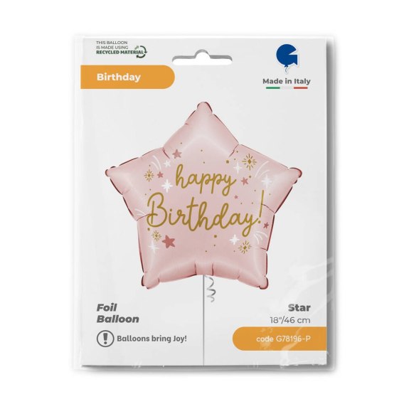 Balon foliowy- różowa, gwiazdka Happy Birthday, 45cm