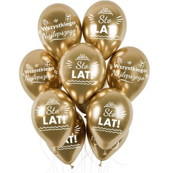 Nasz ulubiony bestseller - Balony lateksowe, złote w wersji Chrome (zwane również glossy lub shiny) z urodzinowym nadrukiem "Sto Lat", "Wszystkiego Najlepszego" oraz Twoje Urodziny".