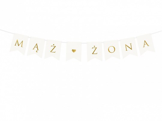 Baner w kolorze białym ze złotym napisem Mąż Żona, do samodzielnego złożenia, zestaw zawiera literki i ok. 2,5m białej tasiemki.