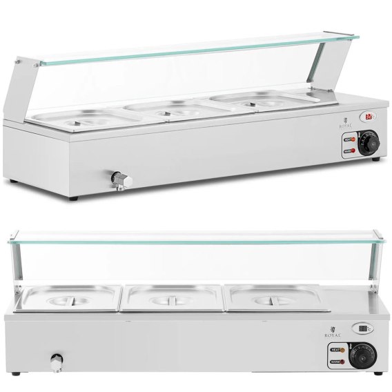 Bemar marki Royal Catering pozwala przechować w 3 pojemnikach gastronomicznych składniki potrawy lub kilka gotowych dań. Sprzęt nadaje się do mięsa, ryb, warzyw, ryżu, ziemniaków, sosów itd. Bemar grzewczy optymalnie zaspokoi potrzeby lokali gastronomicznych nawet wysokiej klasy. Nadaje się do użytku w restauracjach, hotelach, pensjonatach, stołówkach, bufetach, barach z przekąskami, kawiarniach lub domach seniorów i klinikach. Bemar działa na zasadzie konwekcji. Element grzewczy podgrzewa wodę znajdującą się między urządzeniem a pojemnikami GN i przekazuje ciepło do pojemników. Oznacza to, że nawet delikatne dania są podgrzewane i utrzymane w cieple przez długi czas, bez ryzyka przypalenia. Bemar mieści 3 pojemniki GN 1/2 z pokrywkami. Ponadto w bemarze elektrycznym można zastosować inne rozmiary pojemników GN i połączyć je ze sobą. Duża moc 2000 W pozwala szybko podgrzać wodę do żądanej temperatury. Automatyczny termostat włączany jest za pomocą pokrętła, które reguluje temperaturę w zakresie 30-110deg;C. Osłona ze szkła hartowanego chroni żywność przed zabrudzeniem. Pomaga utrzymać jej temperaturę, a jednocześnie umożliwia świetną prezentację. Kranik spustowy ułatwia napełnianie, opróżnianie i czyszczenie sprzętu. Bemar posiada przemyślaną konstrukcję i solidną obudowę. Stal nierdzewna sprawia, że jest bardzo wytrzymały, odporny na korozję, bezpieczny dla zdrowia oraz łatwy w czyszczeniu. Stal nierdzewna ma również doskonałą odporność na zużycie oraz uderzenia. Gumowe nóżki zapewniają stabilne ustawienie i zapobiegają zarysowaniom podłoża.