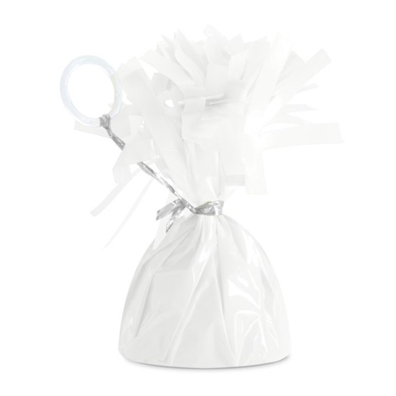 Stożkowy Ciężarek do Balonów na Hel, pokryty błyszcząca folią w kolorze białym.