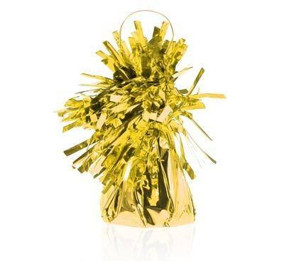 Ciężarek do balonów owinięty folią w kolorze metalicznym złotym.