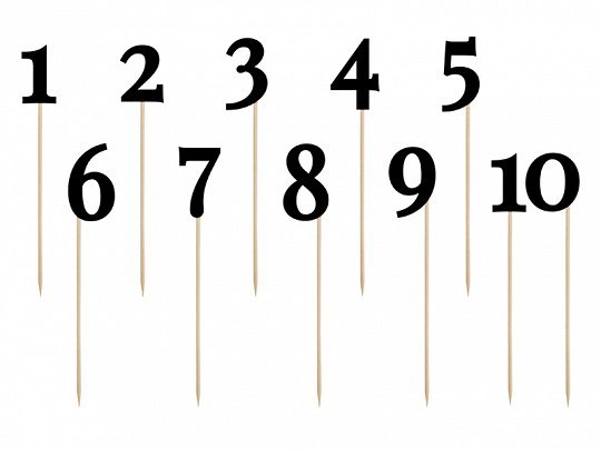 Numery na stół w kolorze czarnym, w zestawie cyfry od 0 do 9, wysokość od ok. 24 do ok. 26 cm.