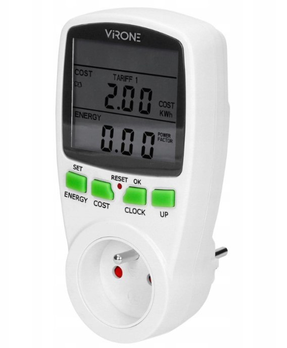 Watomierz umożliwia nam sprawdzenie zużycia prądu elektrycznego i obliczenie kosztów zużytej energii podłączonego urządzenia (2 oddzielne taryfy). Duży wyświetlacz LCD pokazuje dodatkowo aktualny czas, napięcie i natężenie prądu, współczynnik mocy, częstotliwość, maksymalne obciążenie prądu i ostrzeżenie o przeciążeniu, możliwość wprowadzenia 4 rodzajów waluty. Wewnętrzny akumulator: 2 × 1,5V LR44 podtrzymuje ustawienia urządzenia w razie braku prądu.