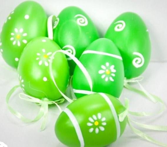 Zawieszane na sznureczku zielone pisanki 6 cm z wstążką. Świetnie nadają się do dekoracji domu na Wielkanoc. Piękne, wiosenne kolory ożywią każde wnętrze nadając mu świątecznego klimatu.