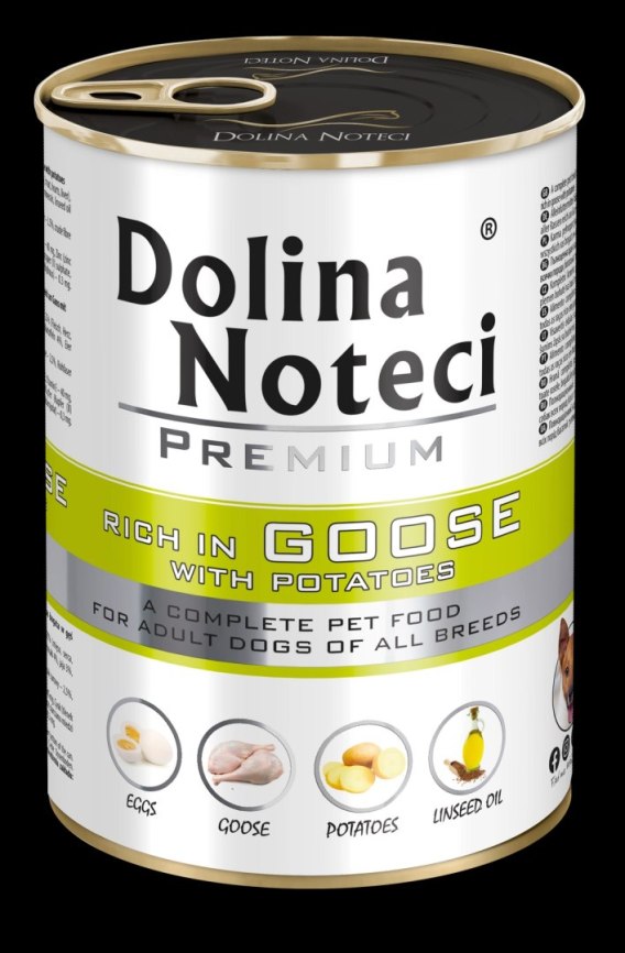 Karma pełnoporcjowa z gęsią i ziemniakami dla dorosłych psów wszystkich ras, będąca szczególnie cennym źródłem aminokwasów, metioniny i cysteiny. Tłuszcz z mięsa gęsi jest cennym źródłem kwasów tłuszczowych wielonienasyconych z rodziny n-6. Gęsina i jej surowce stanowią również źródło żelaza oraz selenu - składników mineralnych, które zapewniają prawidłową funkcję krwi. Dodatek ziemniaków stanowi źródło węglowodanów o wysokim stopniu strawności.