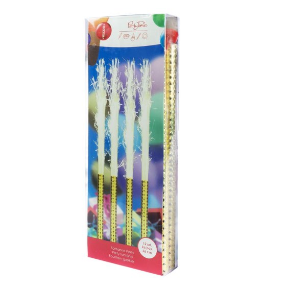 12 fontann party w czterech kolorach w opakowaniu. Fontanna o wysokości 26 cm. Po odpaleniu wyrzuca złote iskierki. Idealne podczas świętowania uroczystości takich jak urodziny, ślub, jubileusz.