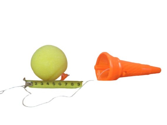 Gra zręcznościowa w kształcie loda w wafelku . Wyrzucanie piłki uruchamia się za pomocą przycisku, który z dużą prędkością wystrzela piłkę z gąbki. ( piłeczka na sznurku , nie będzie uciekać ").