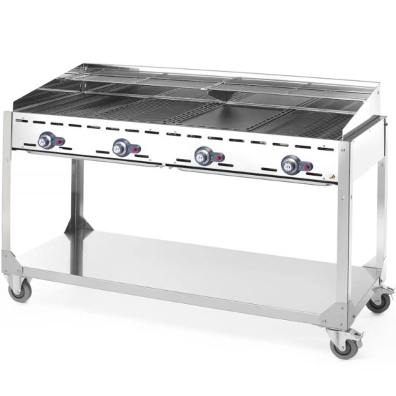 Grill gazowy marki Hendi sprawdzi się w każdej profesjonalnej gastronomii. Grill wyposażony został w osłonę przed wiatrem. Odczepiana podstawa ułatwia transport, a także umożliwia użycie grilla jako wersji stołowej. Grill posiada cztery niezależnie sterowane palniki gazowe, elektroniczny zapłon, przewód gazowy z reduktorem.