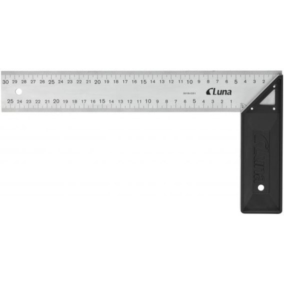Bardzo solidny i precyzyjnie wykonany kątownik warsztatowy. Ramię przykładniowe z odlewu aluminiowego z powierzchniami frezowanymi dla zapewnienia jak najlepszej równoległości. Szerokość przykładni wynosi aż 18 mm, co zwiększa stabilność, a także umożliwia kontrolę np. struganych kantówek wymiarowych z zaokrąglonymi krawędziami. Ramię przymiarowe ze stali nierdzewnej 1.5×45 mm z głęboko trawioną podziałką w mm. Dokładność ±0.03°. Otwór do dołączenia zabezpieczenia narzędzia.