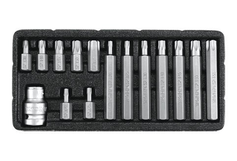Profesjonalny zestaw bitów, służący do odkręcania śrub specjalnych typu: torx secirity. Różnorodność bitów zapewnia możliwość wykonania wielu prac w specjalistycznych serwisach mechanicznych i samochodowych. Końcówki posiadają długość 30 mm, mocowane w uchwycie sześciokątnym 10 mm, dostosowanym do współpracy z grzechotką 1/2.Zestaw wykonany z najwyższej jakości stali stopowej narzędziowej S2, która charakteryzuje się: wysoką twardością HRC 58-62 jednolitą, drobnoziarnistą strukturą materiału odpornością na skręcanie wysokim momentem dokręcania - 21,8 Nm doskonałym zahartowaniem