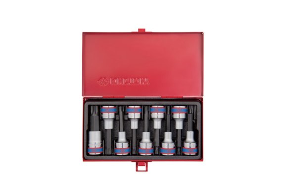 Komplet nasadek z końcówką hex firmy King Tony. Zestaw w metalowej kasecie zawiera 9 długich nasadek w rozmiarach: 4, 5, 6, 7, 8, 10, 12, 14, 17. Nasadki wykonane ze stali chromowo wanadowej, bity z chromowo molibdenowej.