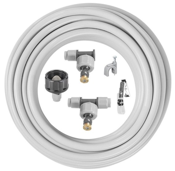 Zestaw zawiera: 7,5 m węża, przyłącze z gwintem wew. G 3/4" - 1, dysze mgłowe - 4, dysze stop - 1, klips - 10, hak montażowy - 10