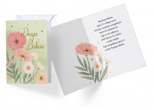 Cechy szczególne: wielkość: B6, 16.6 x 11.7 cm po złożeniu, koperta: dopasowana w zestawie, zdobienia: przynajmniej dwa rodzaje, często więcej - złota, srebrna lub perłowa folia, brokat, tłoczenia, wnętrze kartki: kolorowe, z życzeniami.