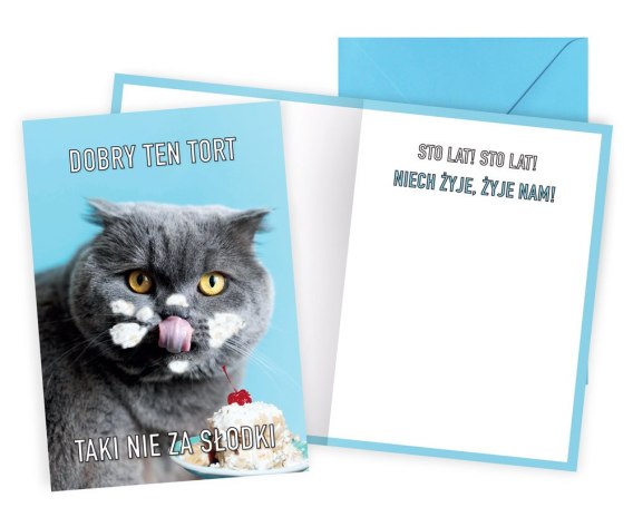 Kartka wielkości B6, zdobiona metaliczną folią. Każda kartka posiada kolorowe życzenia w środku i dopasowaną kopertę w komplecie.