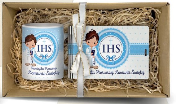 Komplet w pudełku kubek 330ml + banknotówka 10 x 15,5cm NIEBIESKI KOMUNIA ŚW