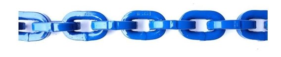 Łańcuch o profilu D bocznie zgrzewany, ocynkowany i lakierowany proszkowo (kolor niebieski), w wiązce po 30 mb.- ok.50 kg, rozmiar 8x28mm, pakowany w plastikowe wiaderka.