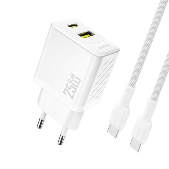 • Ładowarka sieciowa USB-A USB-C z kablem USB-C GaN PD QC 25W - biała