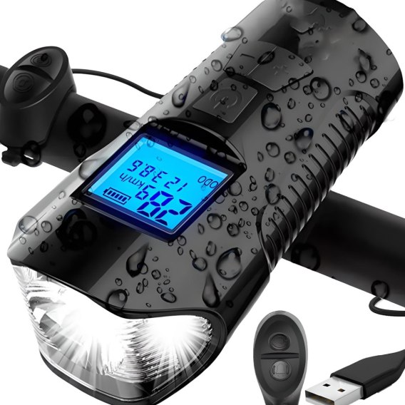 Lampka rowerowa z licznikiem i dzwonkiem 5w1, ładowana za pomocą kabla USB, zwiększa bezpieczeństwo rowerzysty dzięki mocnym diodom LED, które zapewniają doskonałą widoczność na drodze. Urządzenie łączy funkcje oświetlenia, licznika i dzwonka w jednym kompaktowym zestawie.