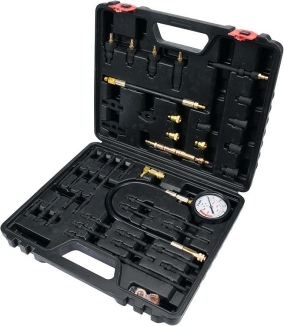 Uniwersalny zestaw do pomiaru ciśnienia kompresji zarówno w silnikach benzynowych, jak i diesla. Pomiaru można dokonać przez świece żarowe lub przez wtryskiwacz.