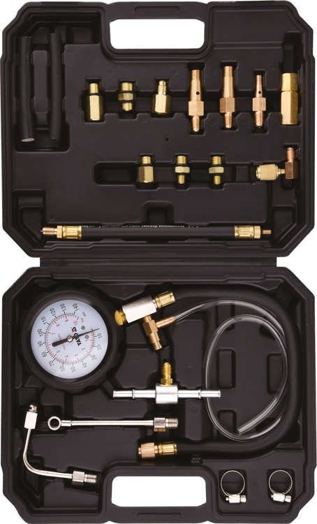 Zawartość zestawu: manometr z podwójną skalą|elastyczny przewód wraz z zaworem odpowietrzającym|końcówki i redukcje
