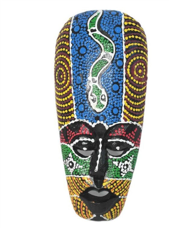 Ręcznie wykonana na wyspie Bali w Indonezji drewniana maska. Długość 30 cm. Malowana kropkami farby. Motyw malowania może być różny na każdej masce.