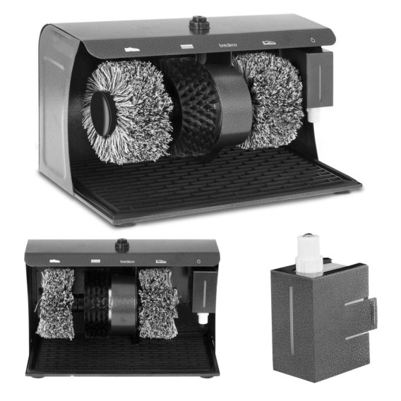 Urządzenie do czyszczenia butów to produkt marki Bredeco nadający się do użytku w hotelach i pensjonatach, a także zakładach pracy i gospodarstwach domowych. Obsługiwany nożnie model BC-S-POL3 pozwala wygodnie (bez potrzeby schylania się) wyczyścić obuwie. Moc sprzętu wynosi 120 W. Został starannie i solidnie wykonany.