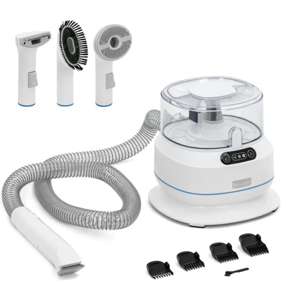 • - Maszynka do strzyżenia psów z odsysaniem i różnymi nasadkami, w tym trzema szczotkami i dyszą szczelinową,