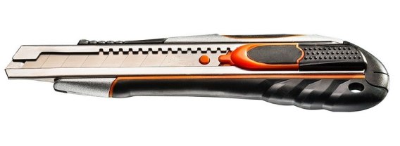 Nóż z ostrzem łamanym NEO (nr ref. 63-050) wyposażony w funkcję szybkiego cięcia wraz z suwakiem blokującym ułatwiają pracę narzędziem. Metalowe prowadnice oraz obudowa ze stopu cynku zapewniają długą żywotność produktu. Dwumateriałowy uchwyt zapewnia bezpieczeństwo i komfort podczas pracy. Marka NEO spełnia oczekiwania profesjonalistów.