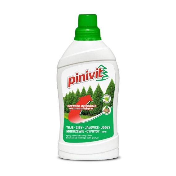 Pinivit - nawóz do Iglaków. Do dolistnego nawadniania - 1litr Pinivit to skoncentrowany, wieloskładnikowy nawóz płynny całkowicie rozpuszczalny w wodzie.Pinivit przeznaczony do dolistnego nawożenia roślin iglastych. Pinivit zawiera niezbędne makro- i mikroelementy zestawione w proporcjach zapewniających harmonijny wzrost i rozwój roślin iglastych. Dzięki temu rośliny osiągają znacznie większe przyrosty, uzyskują ładniejsze wybarwienie igliwia i poprawę zdrowotności, a także są bardziej