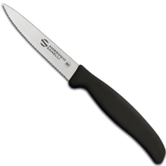 Nóż marki Ambrogio Sanelli z linii SUPRA to profesjonalne narzędzie przeznaczone dla szefów kuchni. Sprawdzi się szczególnie do obierania warzyw i owoców. Posiada ostrze wykonane z wysokiej jakości stali nierdzewnej NITRO-B, w której dodatek cząsteczek azotu znacznie polepsza właściwości antykorozyjne oraz końcową twardość po ulepszaniu cieplnym. Ergonomiczny uchwyt wykonany został z trwałego tworzywa SEBS, które jest elastyczne i odporne na działanie czynników atmosferycznych, ozonu i UV. Nóż nadaje się do sterylizacji, jest wysoce odporny na uderzenia i korozję. Nie nadaje się do mycia w zmywarce.