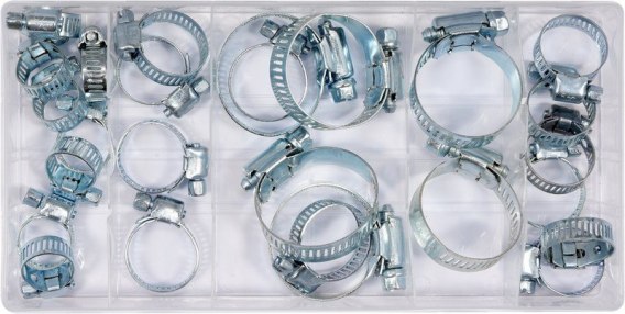 Zawartość zestawu: obejmy ślimakowe x26 (O16 mm x8, O22 mm x6, O25 mm x4, O28 mm x2, O35 mm x2, O40 mm x4)