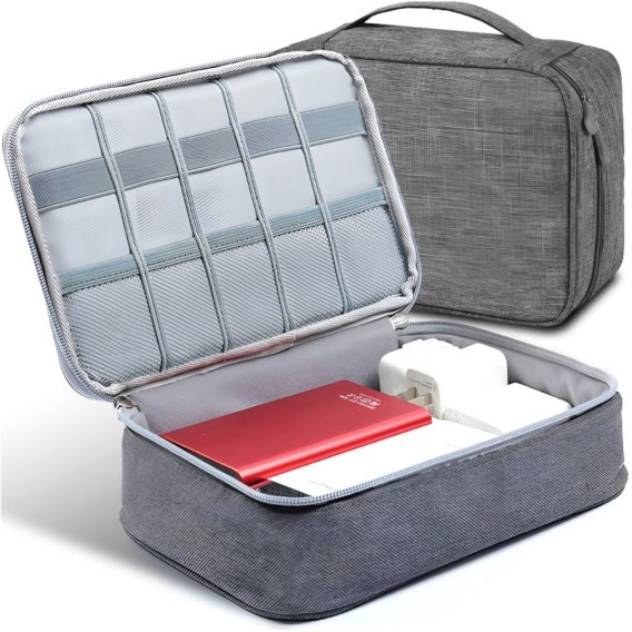 Organizer na elektronikę i akcesoria to praktyczne etui umożliwiające przechowywanie kabli, ładowarek, słuchawek, powerbanków, kart pamięci, dysków, telefonów oraz innych drobnych urządzeń elektronicznych w jednym miejscu. Wykonany z wysokiej jakości, wodoodpornego materiału szarego melanżu, zamykany na dwukierunkowy zamek błyskawiczny, z uchwytem na rękę, jest idealny do domu i podróży. Organizer posiada liczne przegródki i kieszenie, które pozwalają utrzymać porządek i zabezpieczyć elektronikę przed uszkodzeniem.