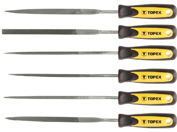 Zestaw pilników iglaków do metalu TOPEX (nr ref. 06A010) o długości 150 mm i średnicy 3 mm. Przeznaczone głównie do precyzyjnego szlifowania metalu. Sześć uniwersalnych kształtów pozwala na różnorodne zastosowanie. Dwumateriałowa rękojeść o ergonomicznym kształcie bardzo dobrze leży w dłoni, co zapewnia wysoki komfort pracy. Marka TOPEX skierowana jest do majsterkowiczów.