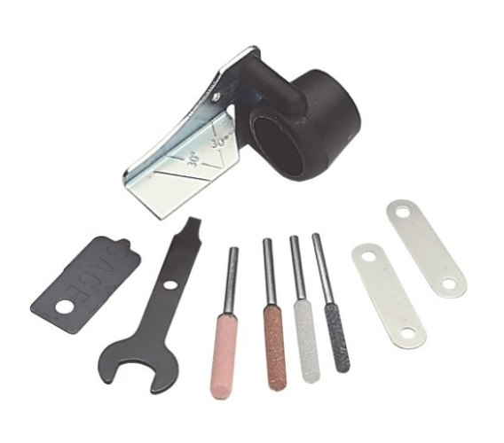 Zawartość zestawu: 1 przystawka do ostrzenia z prowadnicą kątową, 1 przyrząd pomiarowy do regulacji, 1 klucz, 4 kamienie szlifierskie do ostrzenia pił łańcuchowych 4,0 mm (453), 4,5 mm (457), 4,8 mm (454) i 5,6 mm (455), 2 elementy dystansowe, 1 skrócony przewodnik / instrukcja obsługi.