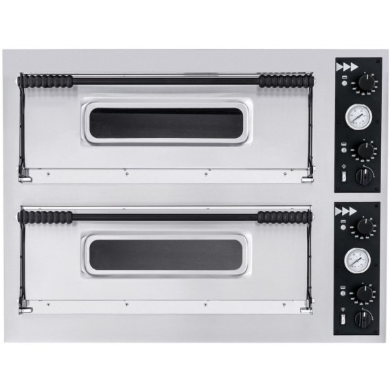 Piec do pizzy firmy Prismafood umożliwia jednoczesny wypiek 2 pizz ø320 mm. Przeszklone drzwi i wewnętrzne oświetlenie komory pozwalają na obserwację wypieku pizzy w komorze. Dno komory wyłożone jest szamotem dla szybkiego i równomiernego nagrzania komory. Urządzenie posiada oddzielone sterowanie temperaturą dzięki osobnym termostatom dla każdej grzałki. Każda komora posiada osobny termometr. Front pieca wykonany został ze stali nierdzewnej.