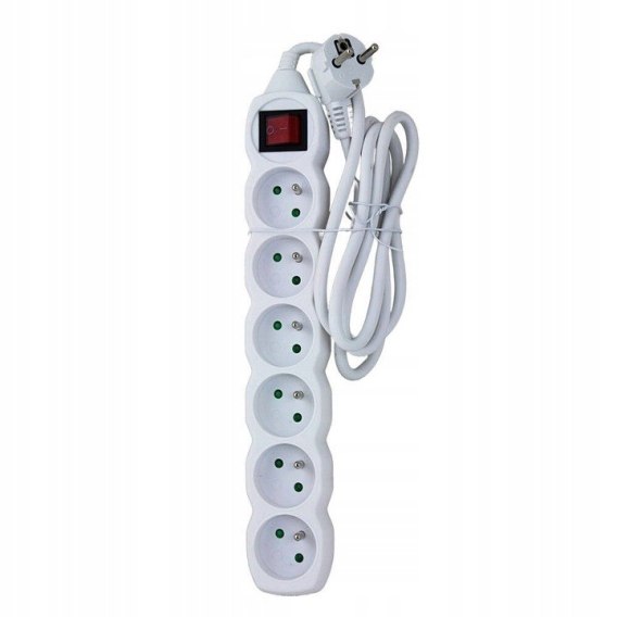Przedłużacz sieciowy w kolorze białym z sześcioma gniazdami przeznaczony do użytku domowego. Przedłużacz pozwala podłączyć urządzenia, które są oddalone od gniazda elektrycznego.
