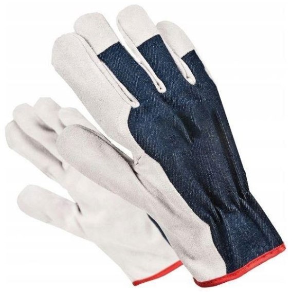 Rękawice ochronne wykonane z wysokiej jakości skóry bydlęcej,skóra bydlęca dwoinowa w kolorze szarym,wierzch wykonanyz elastycznej tkaniny w granatowym kolorze,dzięki czemu idealnie dopasowują się do dłoni,całodłonicowe-część chwytnarękawicy wykonana z jednego kawałka skóry,dzięki czemu wykazują większą wytrzymałość i odporność na przetarcia,palecwskazujący i kciuk w całości wykonane ze skóry,co dodatkowo wzmacnia rękawice,popularnie stosowane do ogólnychprac mechanicznych