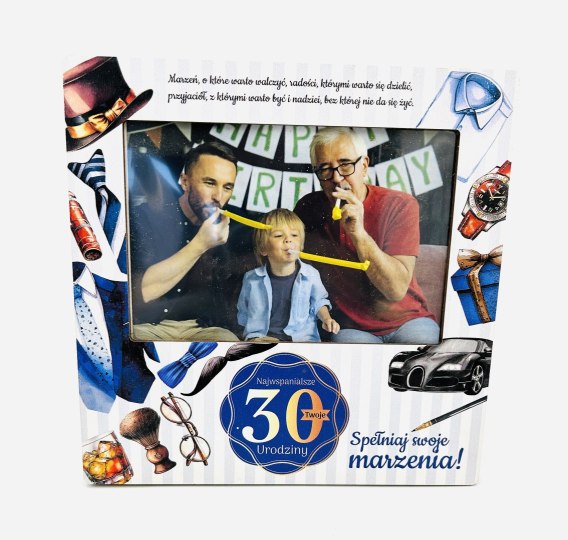 Ramka na zdjęcie dla mężczyzny z okazji 30-stych urodzin. Kolorowy nadruk z życzeniami na urodziny. Ramka na zdjęcie formatu 10 x 15 cm . Pakowane w folię.