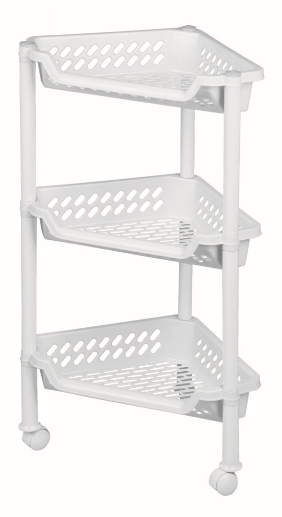 Trójkątny regał idealnie wpasuje się w narożnik pomieszczenia. Regał wyposażony w trzy półki z otworami zapewniającymi lepsze odprowadzanie wody i wentylację w miejscach wilgotnych takich jak łazienka. Regał został wyposażony w kółka ułatwiające przemieszczanie wózka.