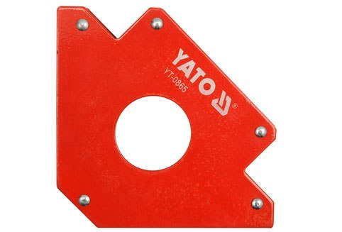 Kątownik magnetyczny wykonany z blachy stalowej oraz silnych magnesów ferrytowych. Umożliwia precyzyjne łączenie materiałów pod następującymi kątami: 45°, 90° i 135°. Udźwig magnesu ok. 34 kg. Posiada otwór służący do montażu elementów walcowych, np. rurek i prętów, o średnicy do 46 mm. Powierzchnia obudowy magnesu lakierowana proszkowo. Przeznaczony do czasowego łączenia metalowych elementów podczas spawania, nawiercania, lakierowania, czynności wymagających używania obu rąk. Stosowanie kątownika magnetycznego pozwala na swobodne operowanie obiema rękami i wstępne montowanie łączonych, metalowych elementów bez pomocy dodatkowej osoby.