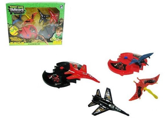 Zestaw zawiera dwa urządzenia do wystrzeliwania 11x8cm , dwa samoloty 8,5cm oraz dwa dinozaury 6cm .