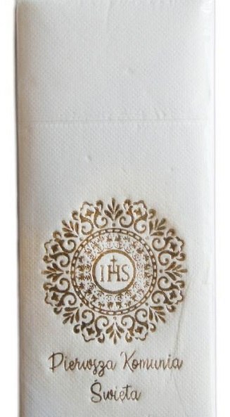 Serwetki 32x38 cm, starannie złożone w formie eleganckich kieszonek na sztućce, z złotym, błyszczącym nadrukiem Hostii i napisem "Pierwsza Komunia Święta" są doskonałym uzupełnieniem każdej komunijnej uroczystości. Wykonane są one z grubej i chłonnej bibuły (100 % celuloza)