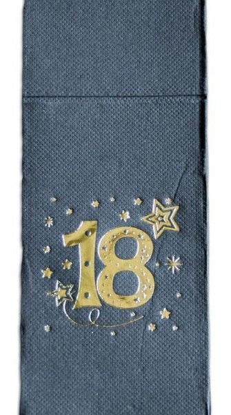 Serwetki 32x38 cm, starannie złożone w formie eleganckich kieszonek na sztućce, z złotym, błyszczącym nadrukiem dużej cyfry "18" są doskonałym uzupełnieniem każdej osiemnastkowej imprezy. Wykonane są one z grubej i chłonnej bibuły (100 % celuloza)