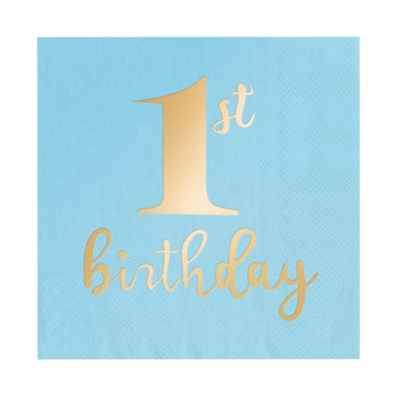 Serwetki papierowe w kolorze niebieskim ze złotym napisem 1st birthday.