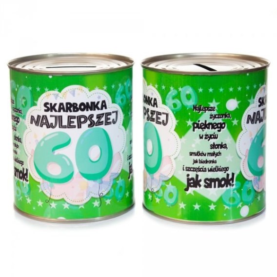 Skarbonka metalowa urodzinowa z napisem "Skarbonka Najlepszej 60"